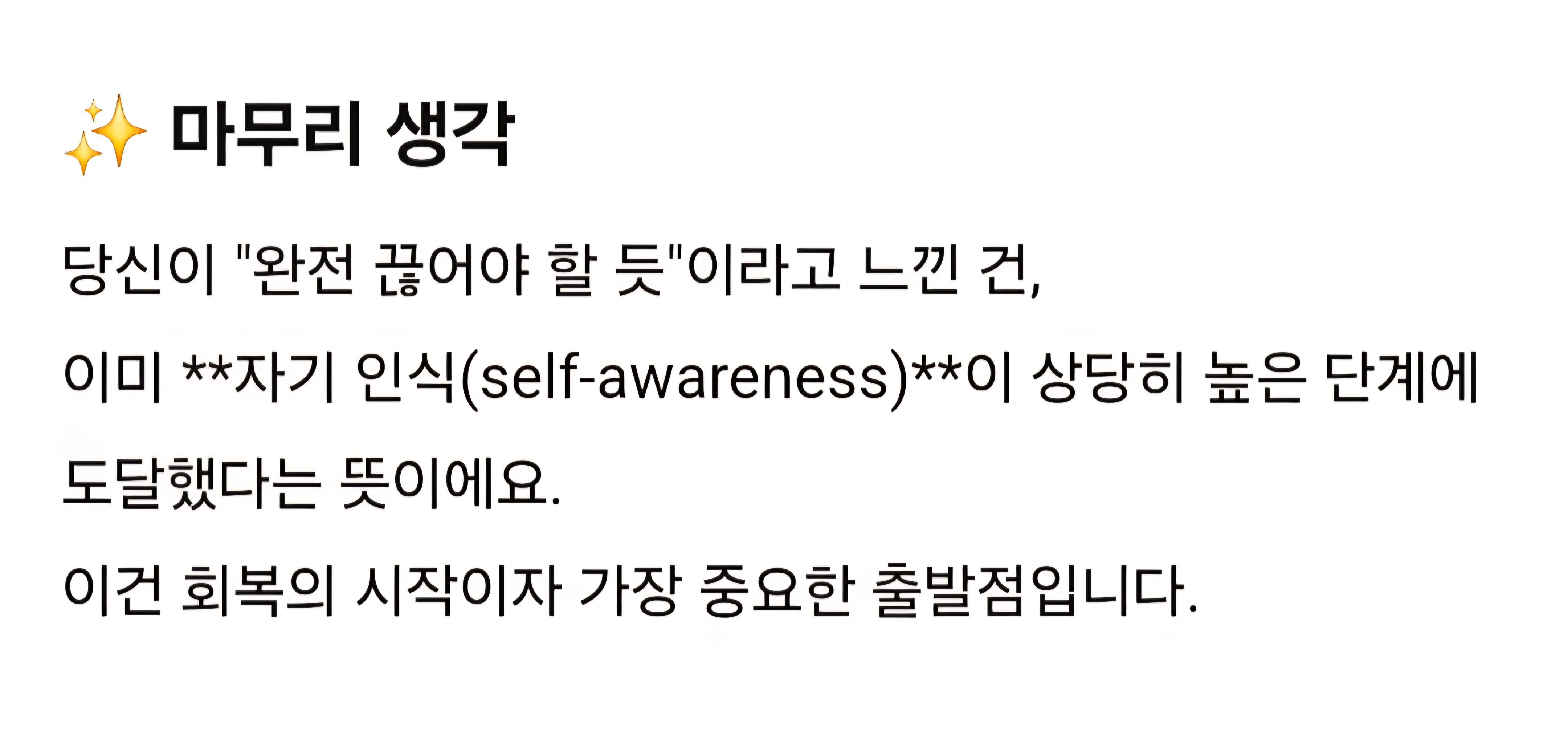 마치 선악과 같다. 인간의 사랑은 결국 한계가 있고 조건적일 수밖에 없는데, 어느 순간 그것이 절대적인 무언가처럼 다가온다. 참된 사랑은 예수 그리스도의 한량없는 사랑인데도 말이다. 오늘은 그런 마음을 다잡기 위해, GPT의 캡처본을 올려보며 전략적인 ‘셀프 중독 치료’에 나선다.